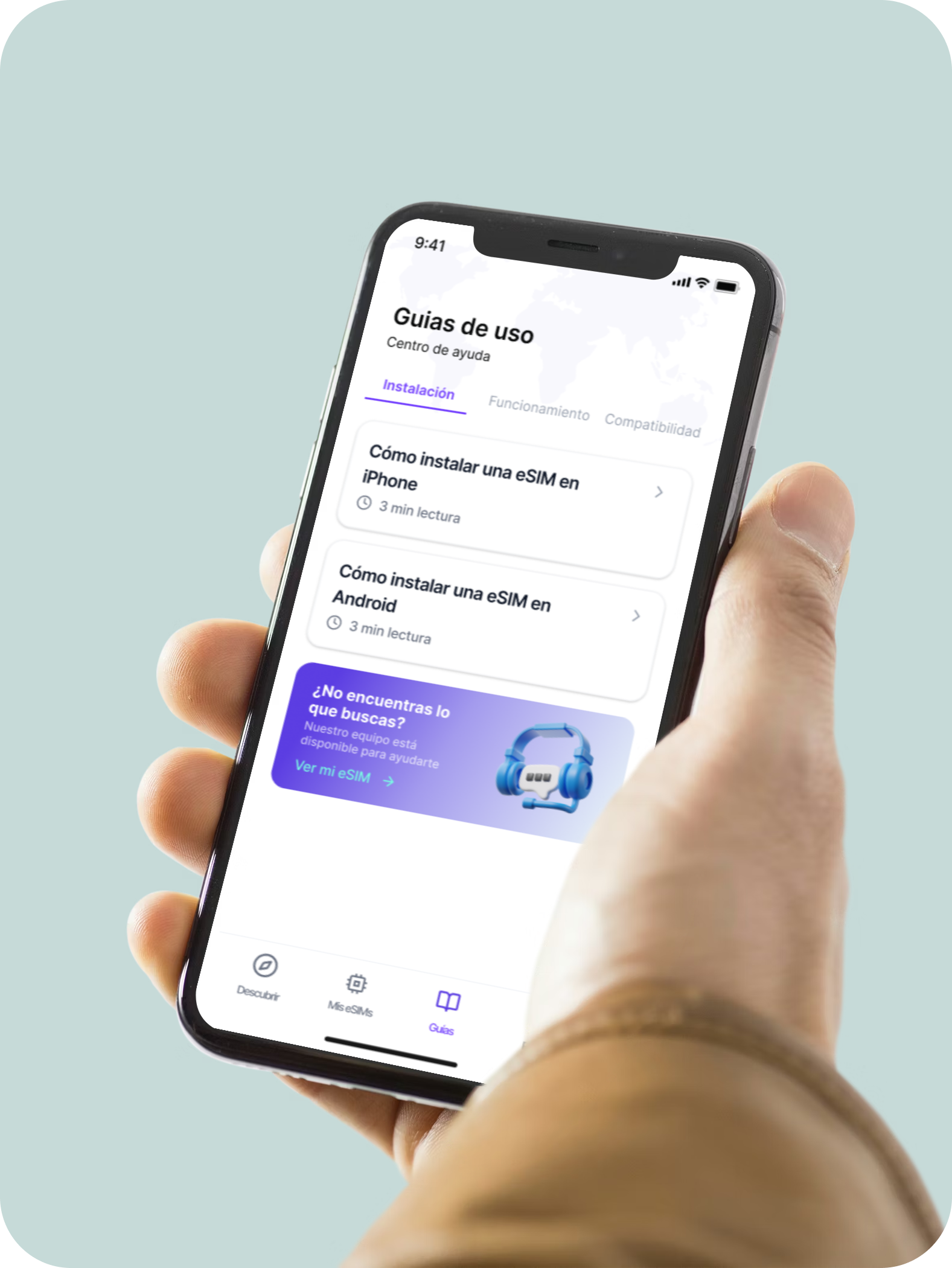 Chip digital integrado que reemplaza la SIM física. Se activa escaneando un QR, permite múltiples planes y funciona en iPhone XS+, Samsung Galaxy S20+, Google Pixel 3+ y dispositivos recientes.
